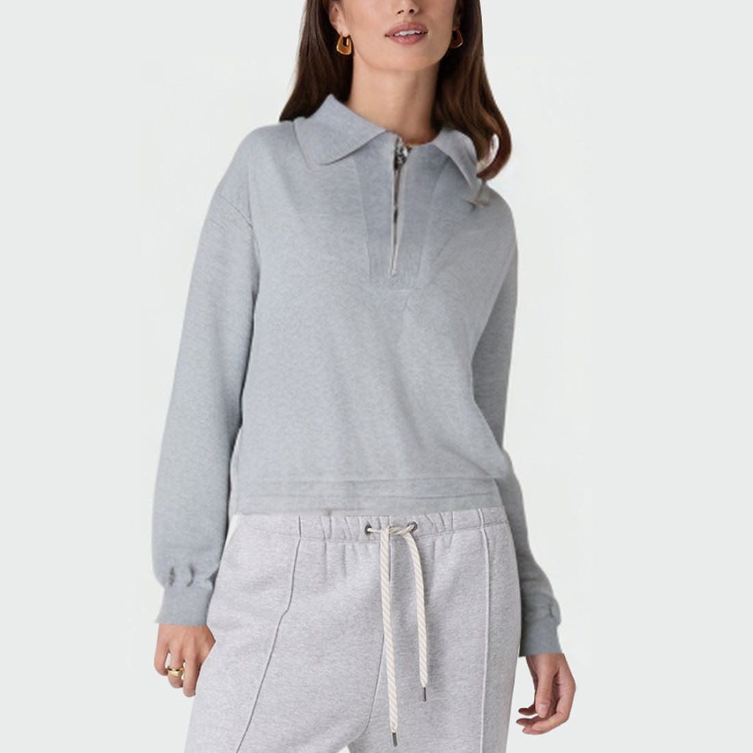 Solid color design: Simple and versatile, perfect for everyday casual wear, at home, or light exercise.Lapel design: Classic lapels add a touch of sophistication while providing light wind protection.Half-zip closure: Easy on and off, with an adjustable collar, combining functionality and style.Dropped sleeves: Relaxed, dropped shoulders for a comfortable, relaxed fit and freedom of movement.Elastic cuffs: Fits snugly around the wrist, maintaining a clean sleeve shape and enhancing comfort.Material: 80% cotton, 20% polyesterCare: Hand wash or gentle machine wash recommended. Avoid bleach. Iron on a low heat setting and avoid direct heat. Hang to dry naturally, avoiding prolonged exposure to direct sunlight.