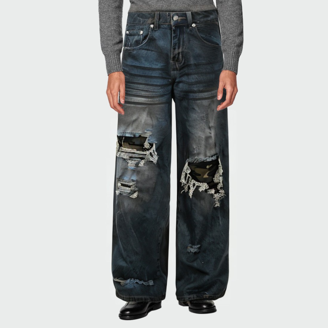 Distressed Wash: A unique wash process creates a naturally faded effect, showcasing a vintage streetwear vibe.Distressed Hole Details: Subtle wear and tear add a touch of personality and style to the look.Button-Zip Fly: A classic fly provides durability and easy on/off.Classic Five-Pocket Design: Strategically placed front and back pockets provide practical storage.Straight-Leg: A standard straight-leg fit for a comfortable, slim fit, perfect for a variety of body types and everyday wear.Material: Polyester/CottonCare: Wash inside out in cold water. Avoid bleaching. Avoid high-heat tumble drying; air drying is recommended. Low iron is permitted.
