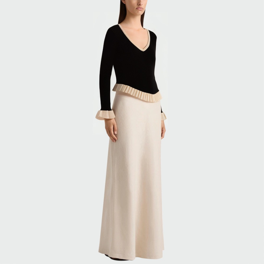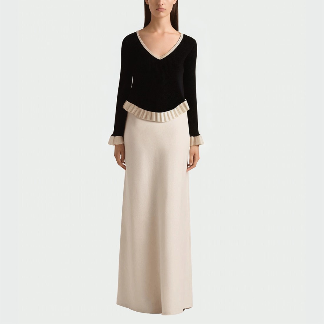 V-neck design: Simple and elegant, it flatters the neckline and highlights a woman’s elegant temperament.Flare cuffs: Unique flared cuffs add a touch of movement and a stylish touch.Contrast trim: Detailed contrasting colors add a visual highlight to the overall look.High-low ruffle hem: Layered design creates a light and graceful feminine charm.Slim fit: Fits snugly and contours naturally, balancing comfort and aesthetics.Material: 100% polyesterCare: Hand wash or machine wash on a gentle cycle, max 30°C. Do not use bleach. Iron at a low temperature to prevent damage from heat. Hang to dry naturally, out of direct sunlight.
